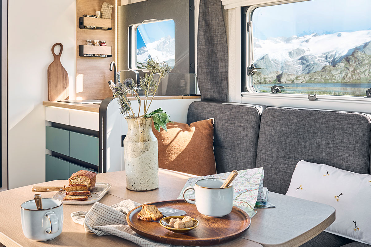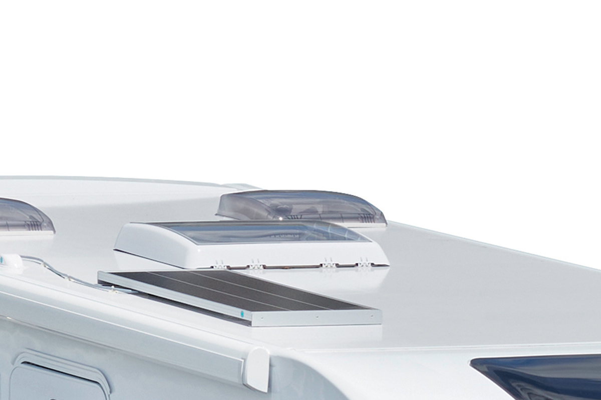 Équipements soute (1 point d'éclairage, 1 prise 230 V, rails d'arrimage, douchette eau chaude / eau froide), store banne, caillebotis, porte-serviettes repliable, poubelle intégrée avec accessoires pour compartimenter, réservoir des eaux usées hors-gel, détendeur / inverseur Crash Sensor Truma®